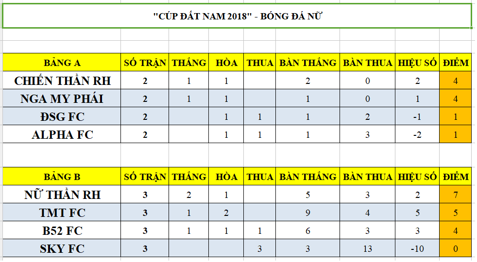 Bảng xếp hạng bóng đá nữ.