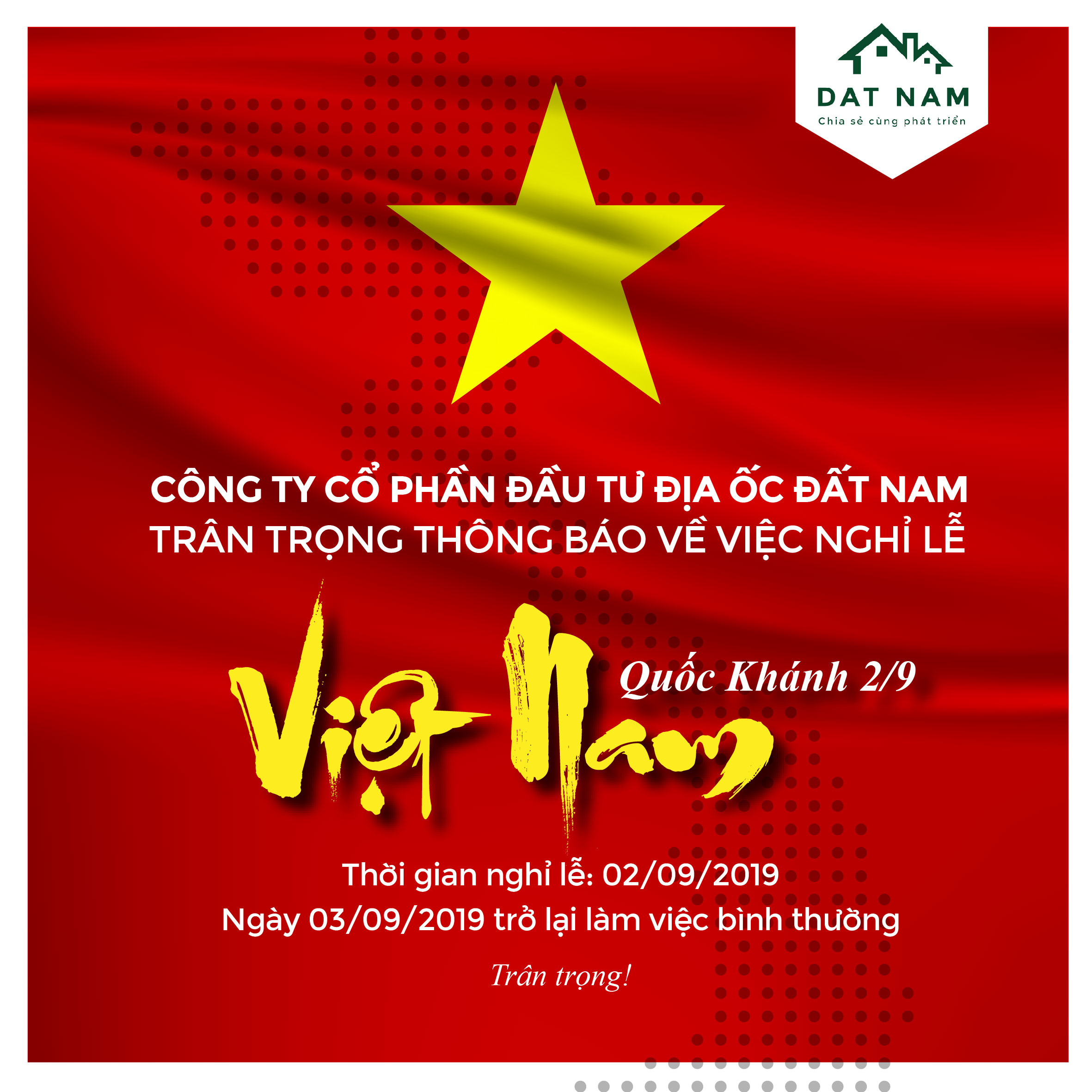 ĐỊA ỐC ĐẤT NAM TRÂN TRỌNG THÔNG BÁO LỊCH NGHỈ LỄ QUỐC KHÁNH 2/9